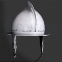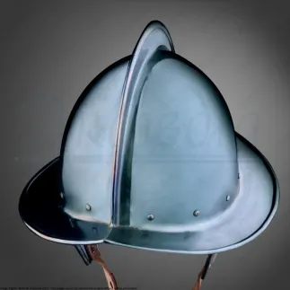 L'un des casques les plus populaires du 16ième, forgé d'après les modèles du début du 16ième siècle. De petits trous sont perçés au niveau des oreilles, autour du motif floral, pour ne pas condamner l'ouïe. Ce modèle offre une excellente protection, en particulier au niveau du cou.