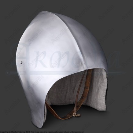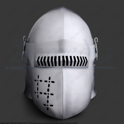 Le heaume à commencé à être vu sur les champs de bataille au début du XIIIe siècle, et sera utilisé pendant les 3 siècles suivants. C'est une pièce simple et élégante, qui à prouvé son efficacité même contre les cavaleries. Ce casque est inspiré d'une pièce retrouvée en Poméranie, datée d'environ 1250, et aujourd'hui exposée au Musée de l'histoire de Berlin.
