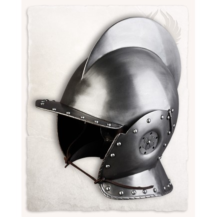 Casque rembourré, basé sur un modèle historique. Acier en 2MM. Lanière de cuir inclue. Pour l'entretien de vos pièces de métal, pensez à utiliser les éponges abrasives et à huiler vos pièces d'armures.