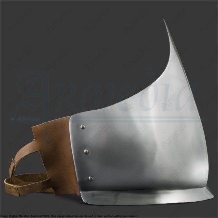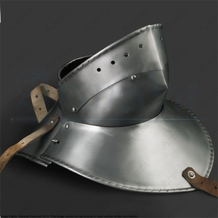 Le bassinet est le casque le plus courant chez les cavaliers et l'infanteries à partir de 1300 jusqu'à environ 1420. Des troupes entières portaient ce genre de protection. Sa forme pointue est spécifiquement conçue pour éviter toute atteinte au cou en déviant la lame vers l'extérieur.
