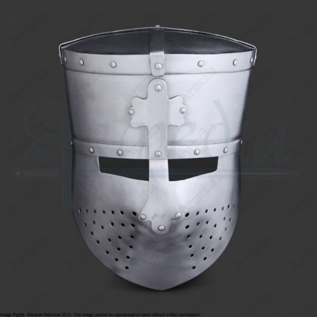 Sometimes knights prefers protection to vision for obvious reasons. Even when on ancient times, the spangenhelm offered protection for the face of the wearer in some versions, the Topfheml (literally Pot Helmet) seems to appear due to the new tactics of the late medieval age. Our “Early Top Helmet” is one of the earlier versions of these Topfhelms, suitable for Knights and Infantrymen.