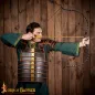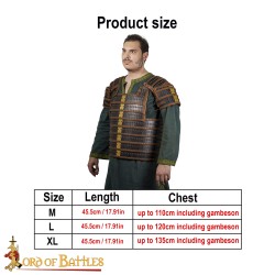 The 20 gauge plates are bound with thick leather backing and fitted to a robust, genuine leather frame for the armour. While donned, it is tied and secured in the back with leather cords and matching leather tabs. It is available in three sizes: medium (chest up to 110cm), large (chest up to 120cm) and extra-large (chest up to 135cm) (Measure yourself WITH gambeson) and is highly adjustable thanks to its multiple genuine leather straps.